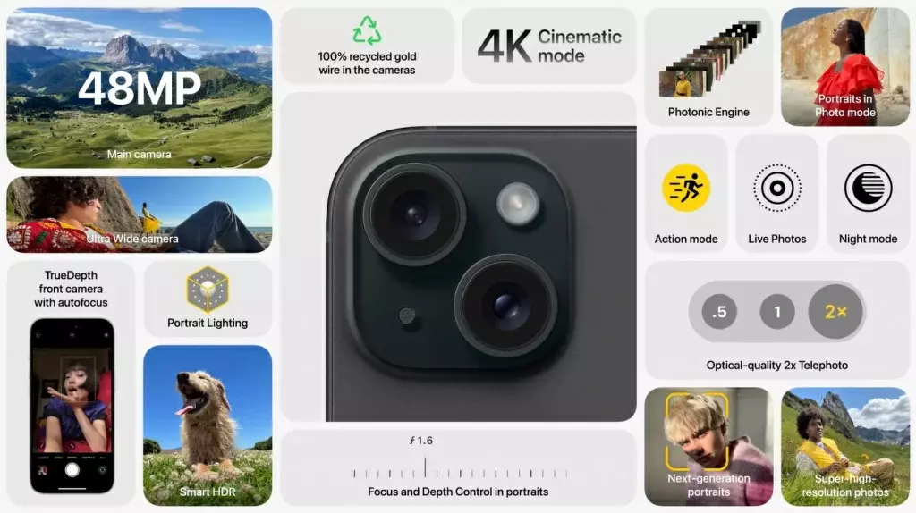 Важнейшим апгрейдом новых iPhone 15/Plus по сравнению с предшественниками стали камеры. Главная камера построена на новом 48-Мп датчике изображения, который поддерживает также двукратный зум без потери качества. Поддерживается оптическая стабилизация. Вторая камера, как и раньше оснащается сверхширокоугольным объективом. Также появился новый портретный режим, который включается автоматически, когда камера видит, что вы сфокусировались на человеке или домашнем животном.